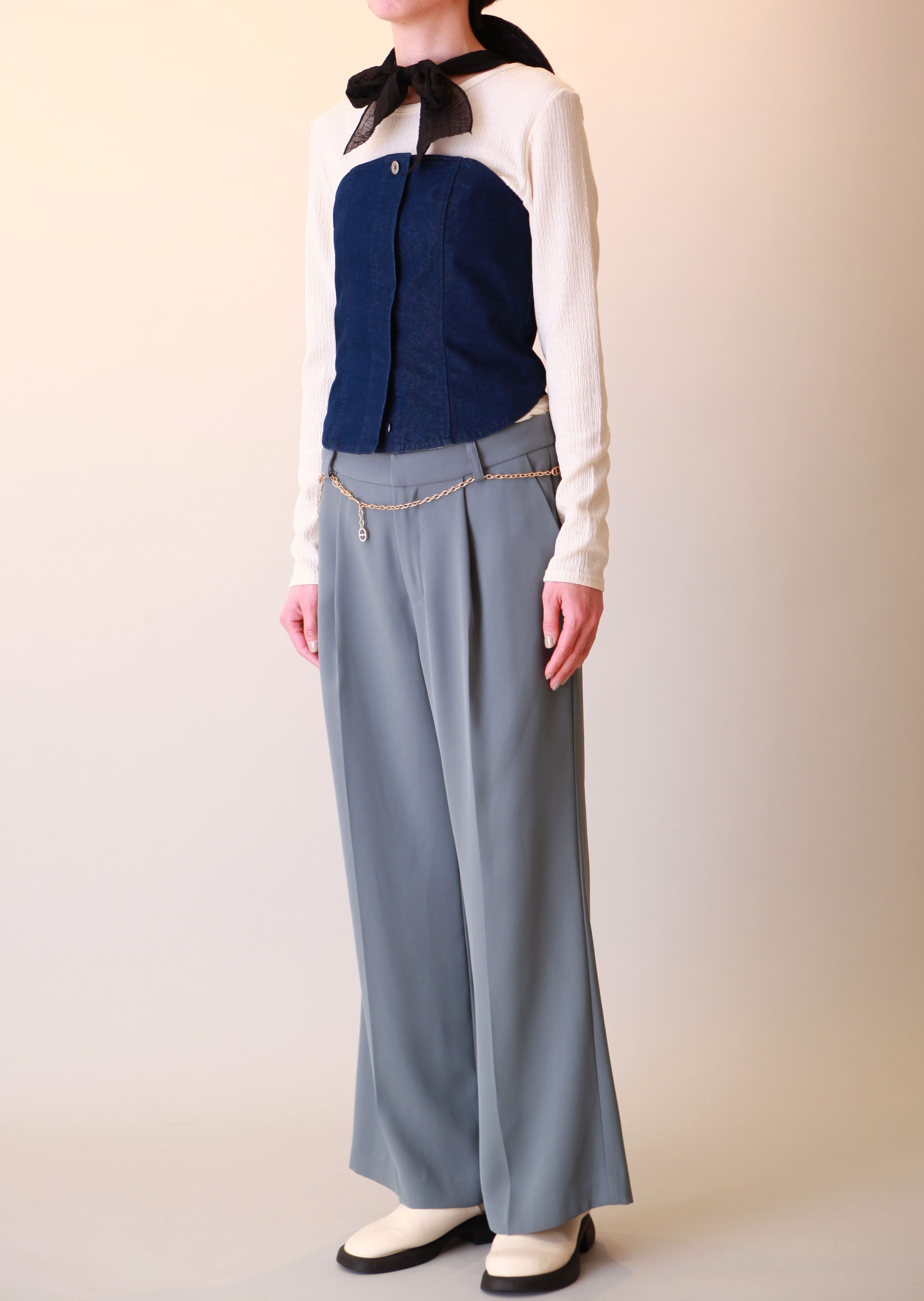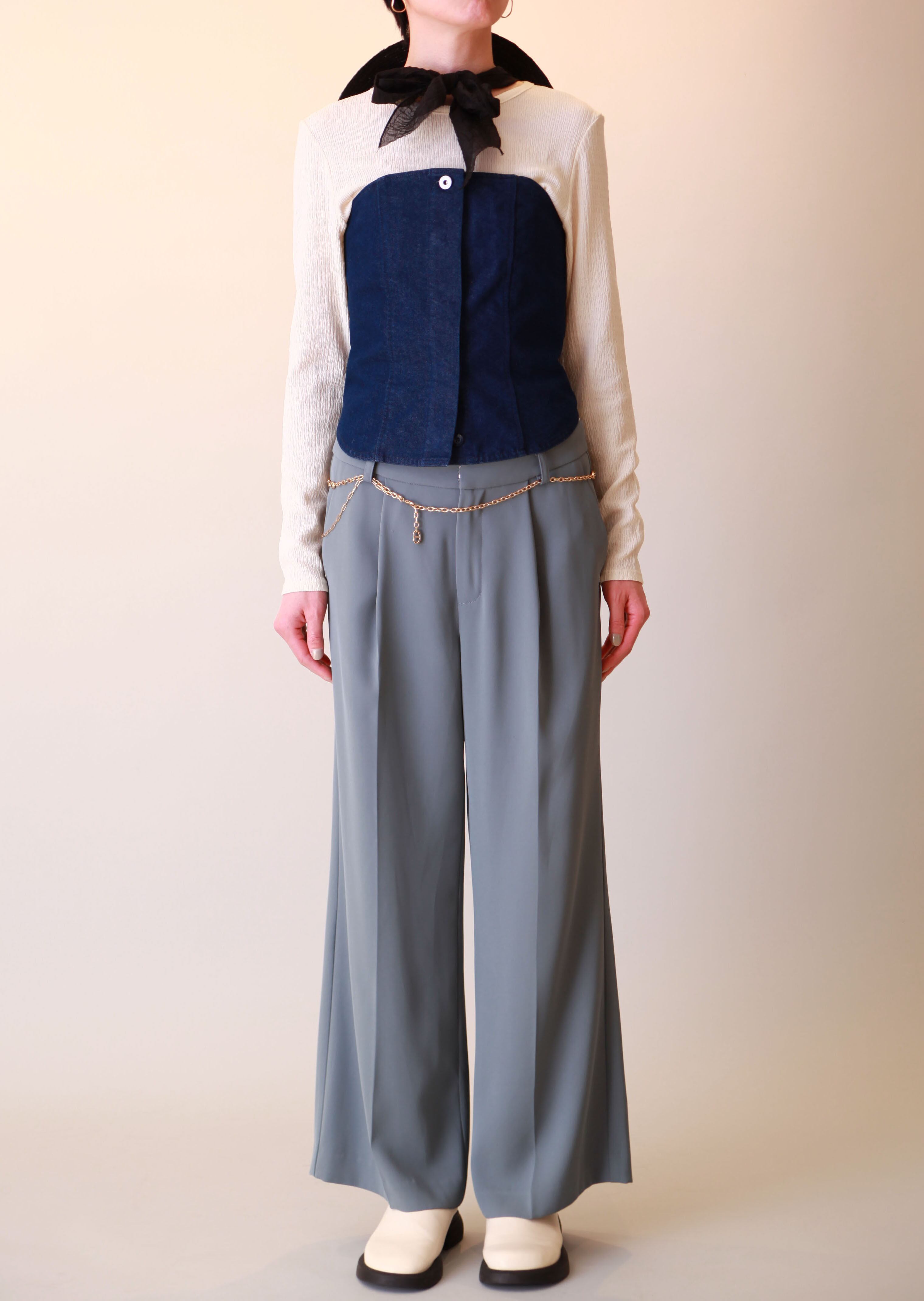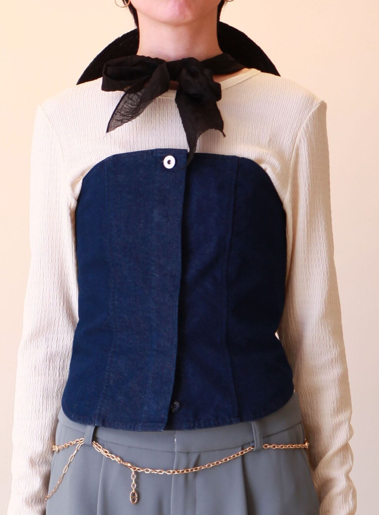 柔らかいデニム生地を使用したデニムビスチェです。肩紐有り無しどちらでもご着用頂けます。一番上のタック釦のみ止めてのスタイリングの巾が広がります。ウォッシュデニムには箔プリントが施されており、casualstyleでもmodestylingでもお楽しみいただけます。