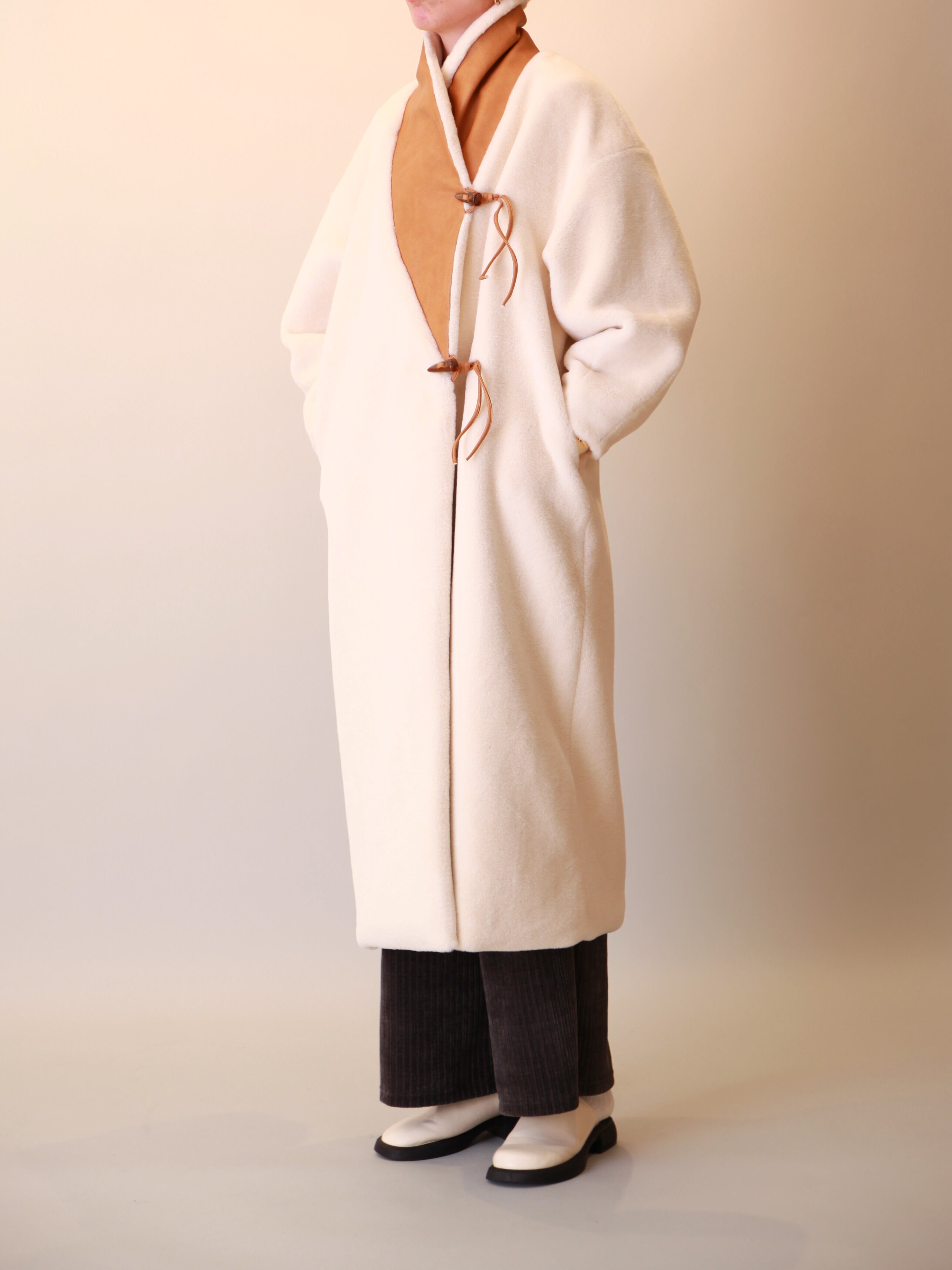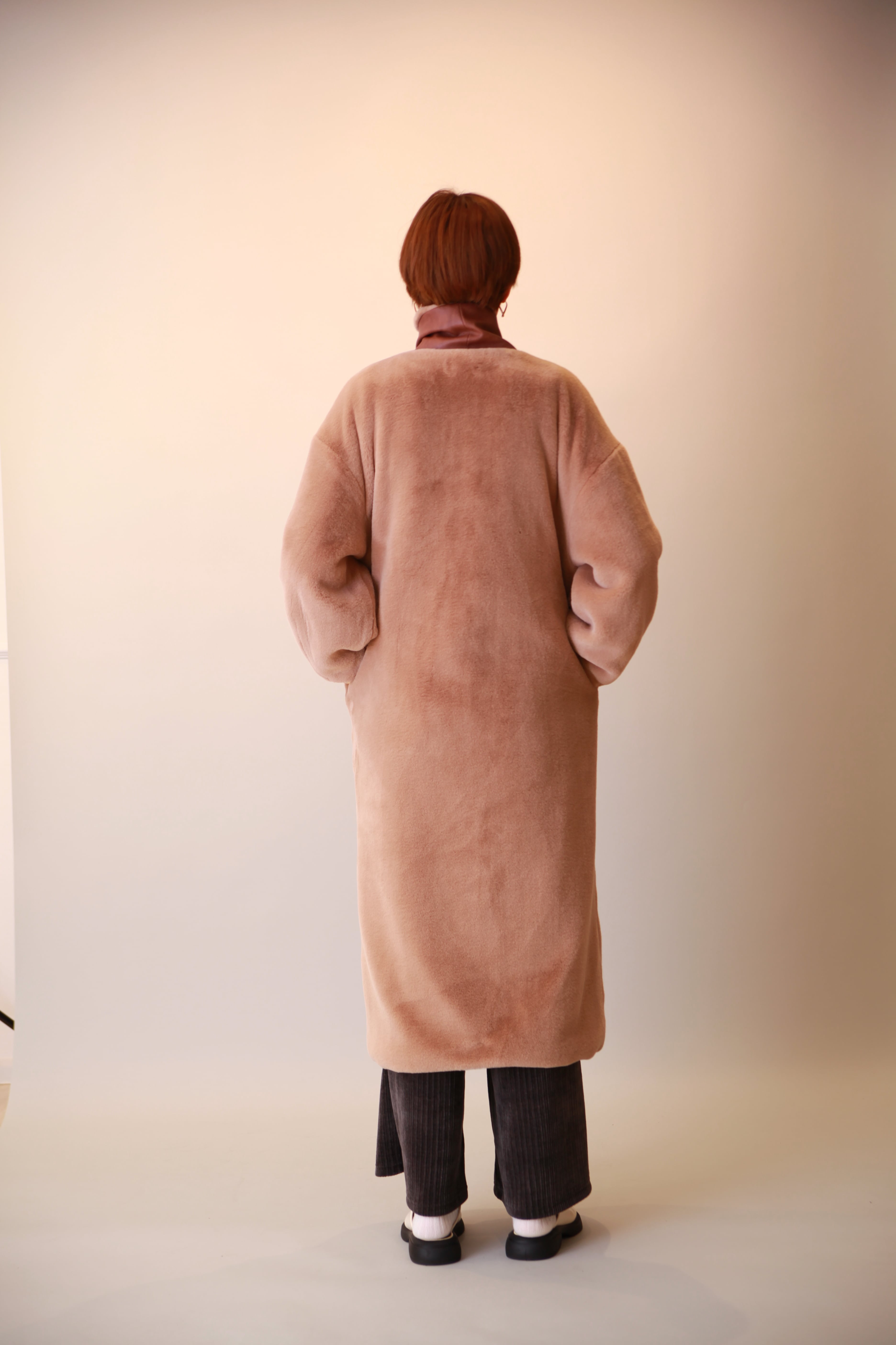 Wショールカラーファーコートは、上質でもちもちなファー素材を使用した、ラグジュアリー感溢れるデザインアウターです。エコレザーのショールカラーが顔周りを優しく引き立て、華やかな印象を与えてくれます。トレンドを意識したシルエットで、スタイルアップも期待できる一着です。