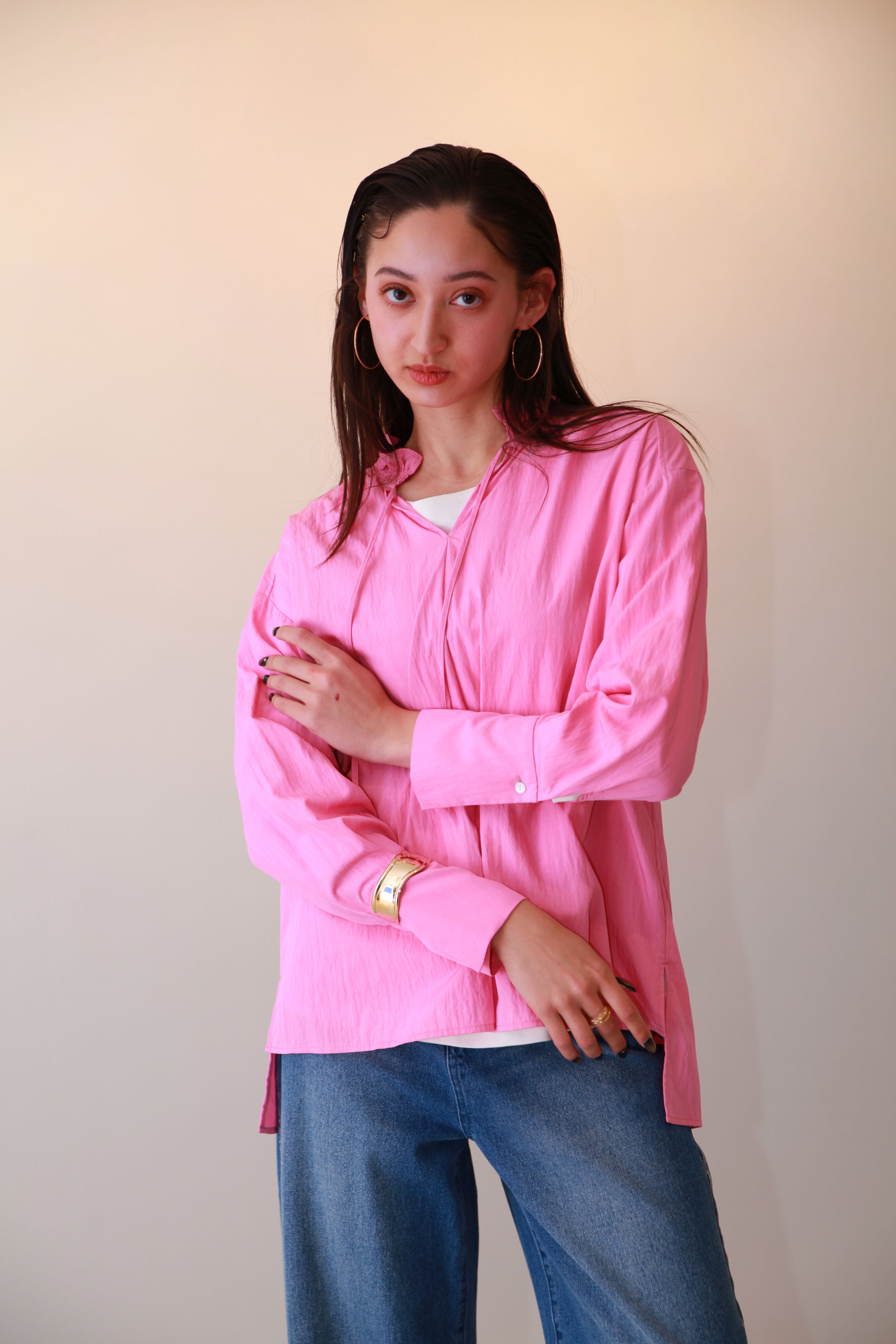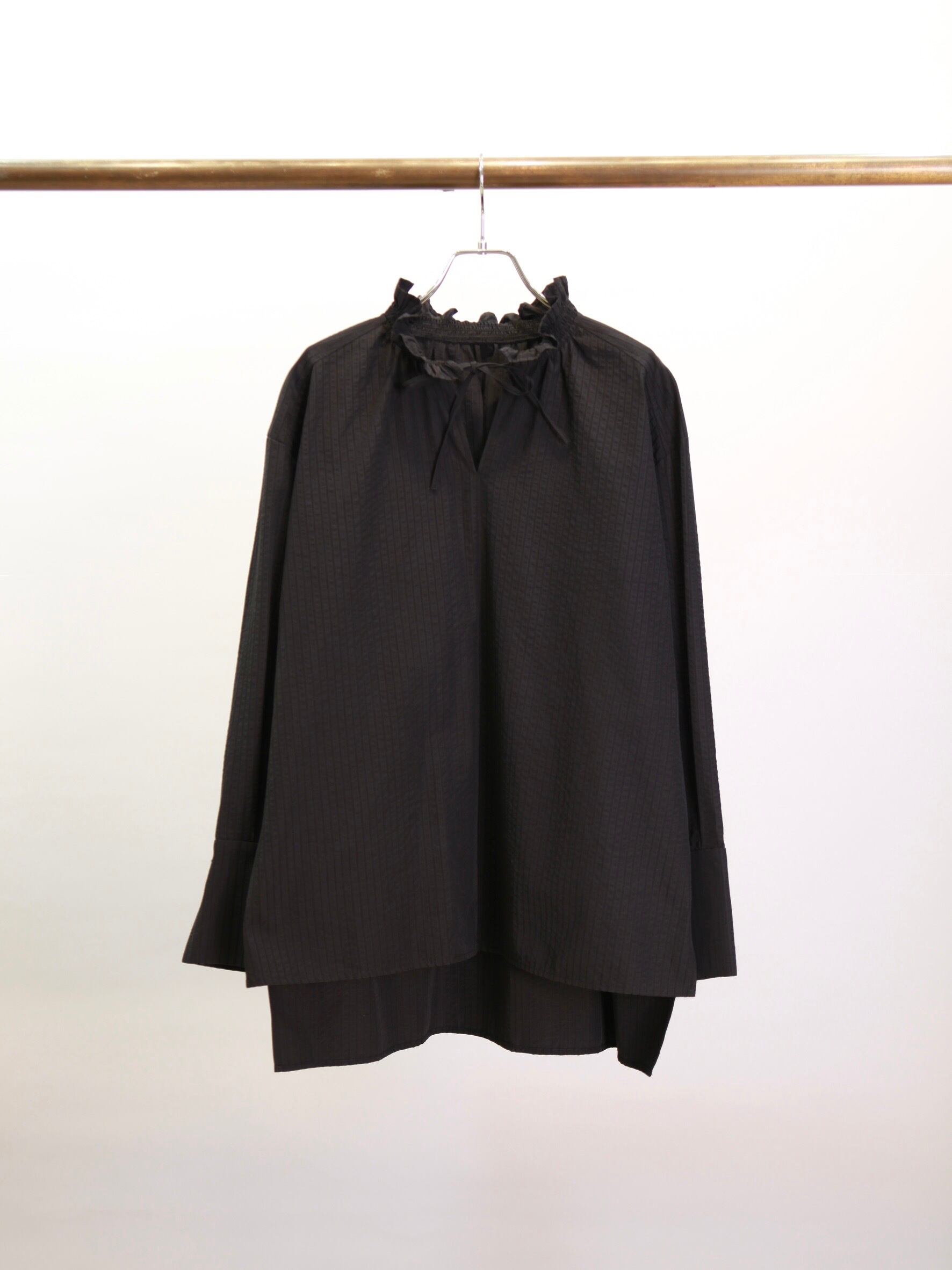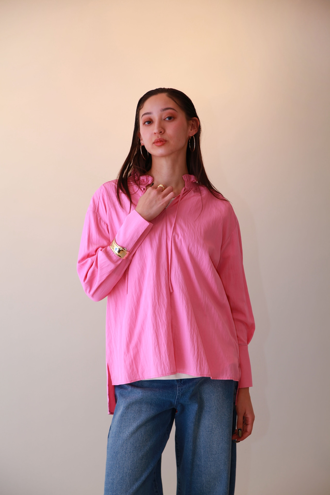 襟ぐりのシャーリングが女性らしさを引き立てるブラウスです。フロントの細リボンは結んでも、さりげなく垂らすスタイルも楽しめます。一枚での着用はもちろん、インナーとの重ね着でこなれ感がでるのも魅力の一つです。デイリースタイルにちょっとした華やかさをプラスするアイテムとしておすすめです。