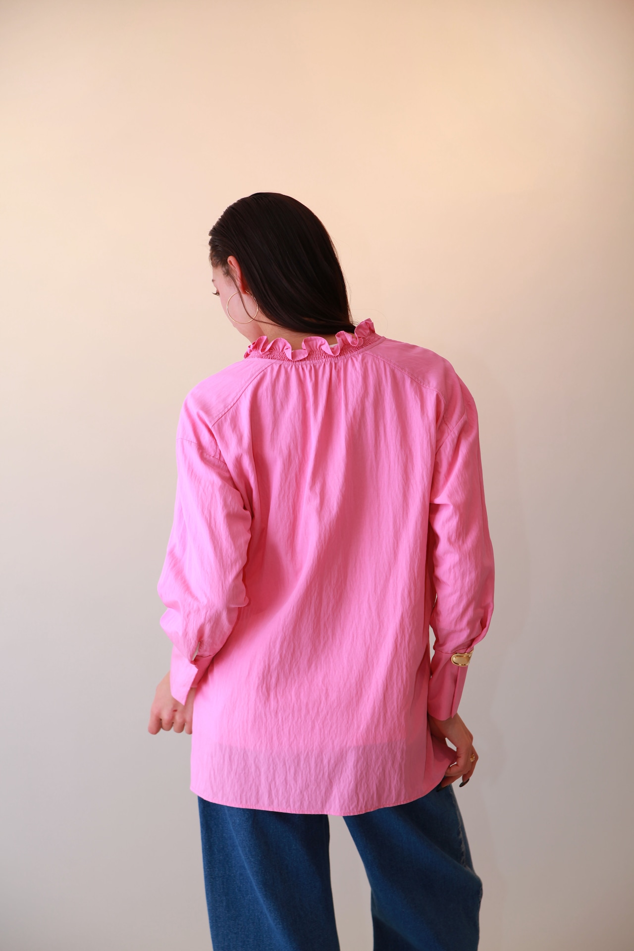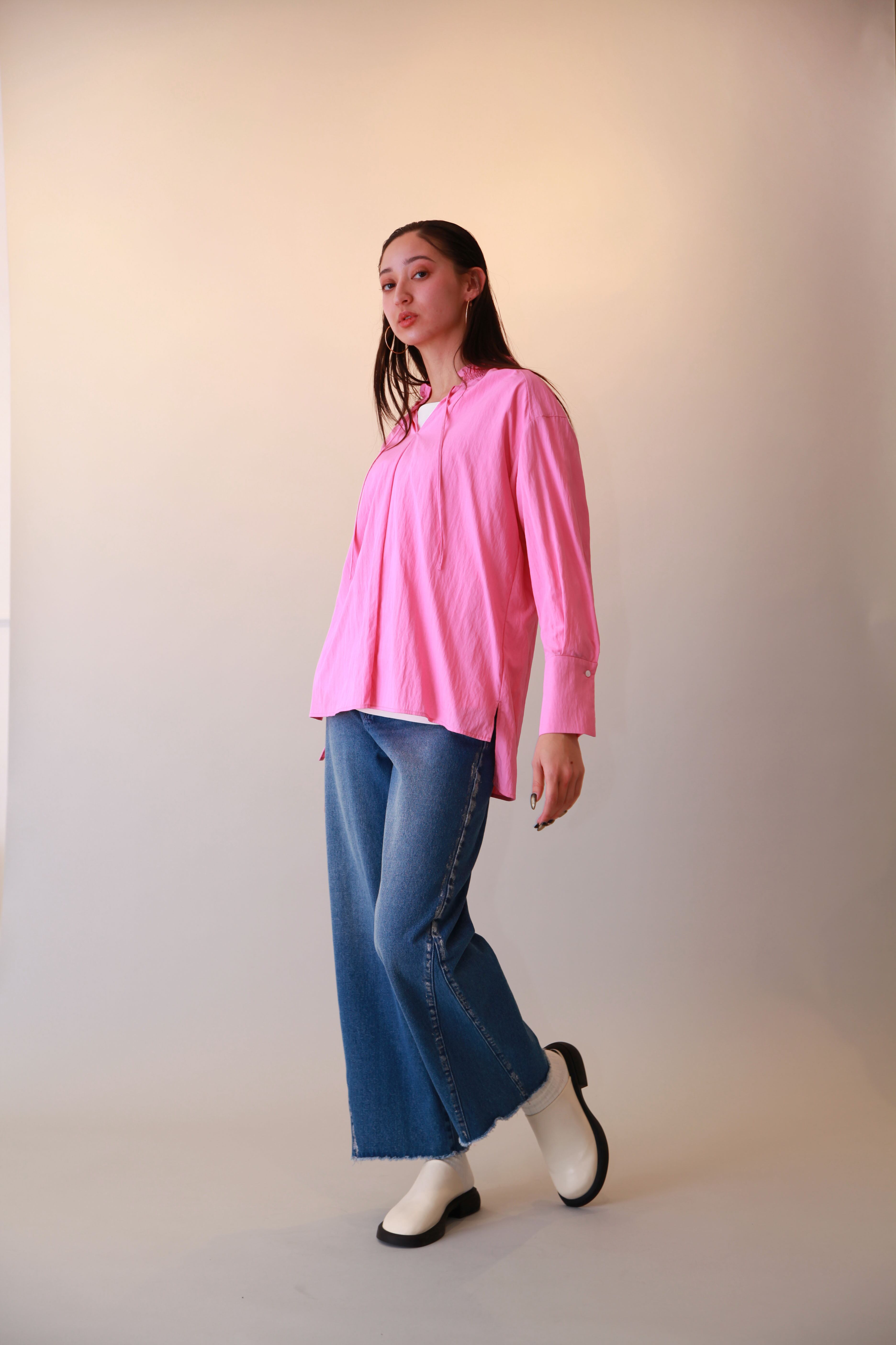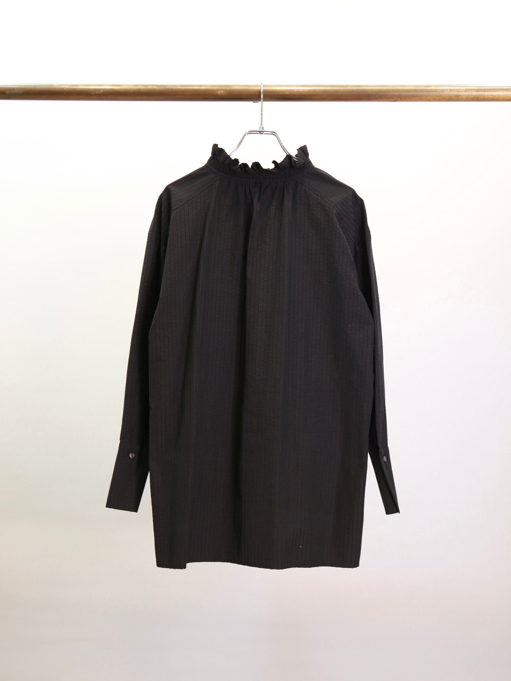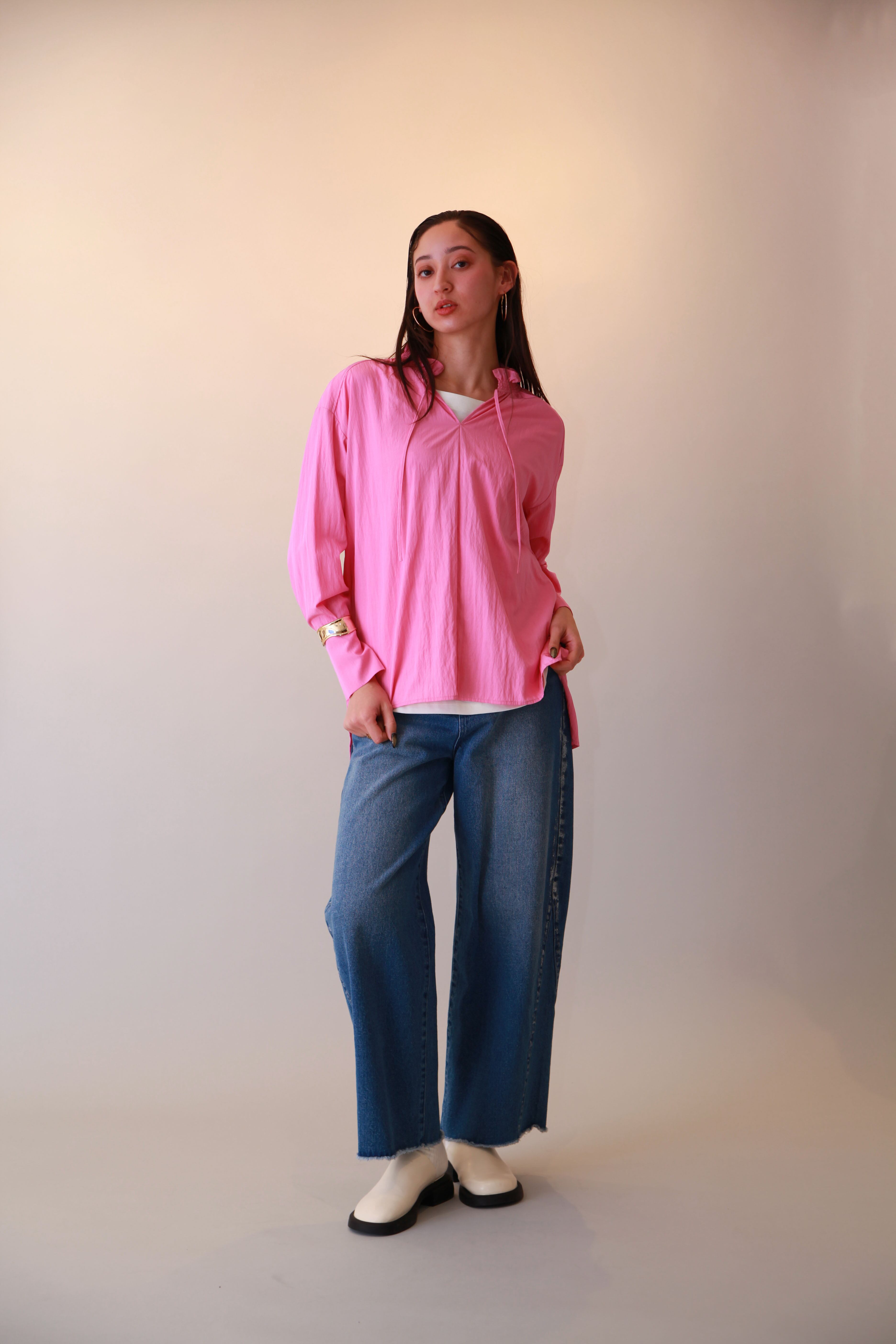 襟ぐりのシャーリングが女性らしさを引き立てるブラウスです。フロントの細リボンは結んでも、さりげなく垂らすスタイルも楽しめます。一枚での着用はもちろん、インナーとの重ね着でこなれ感がでるのも魅力の一つです。デイリースタイルにちょっとした華やかさをプラスするアイテムとしておすすめです。