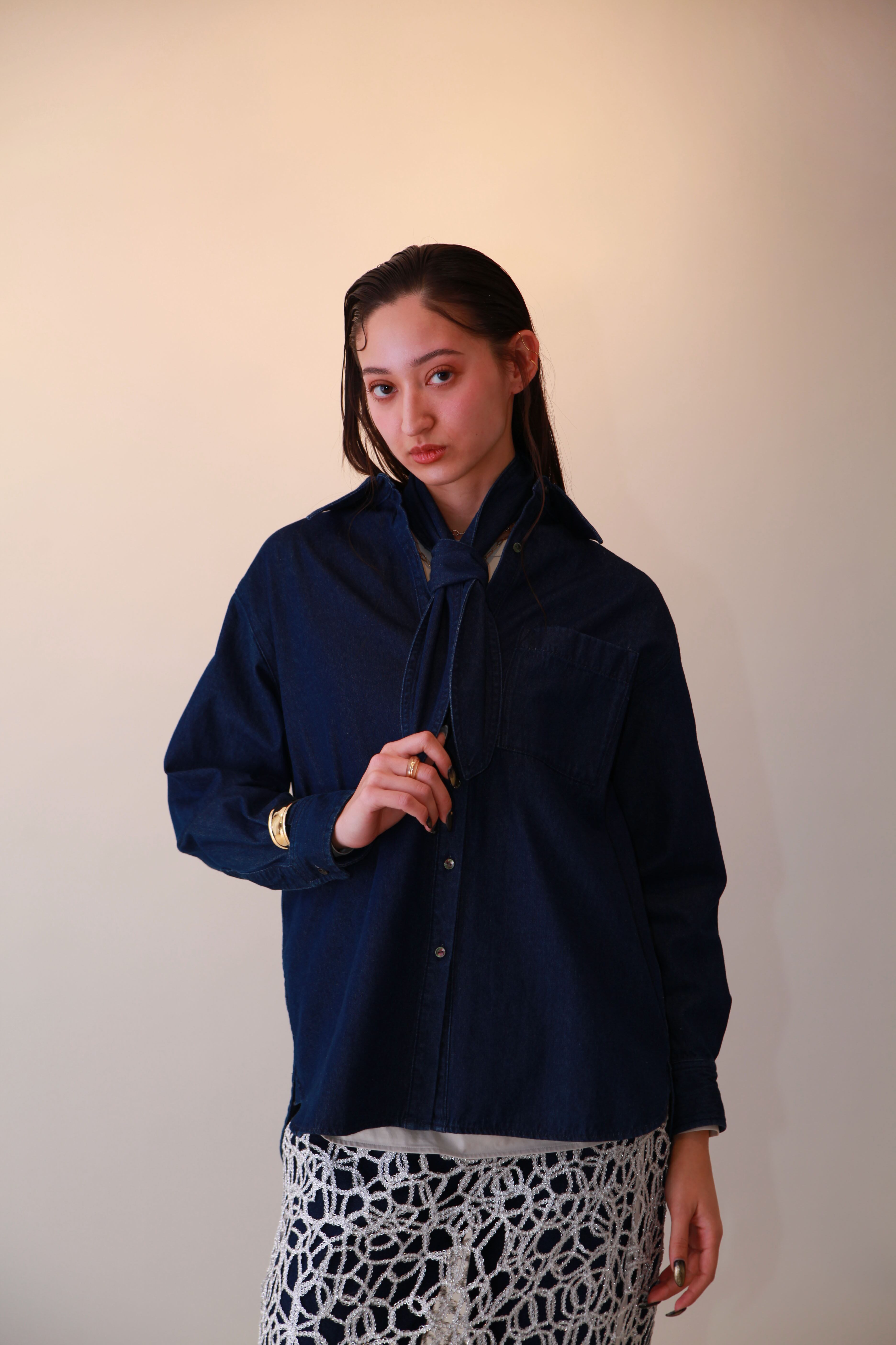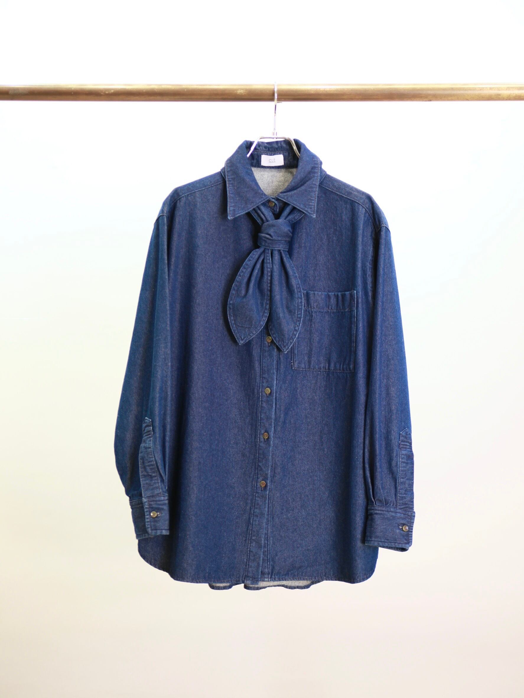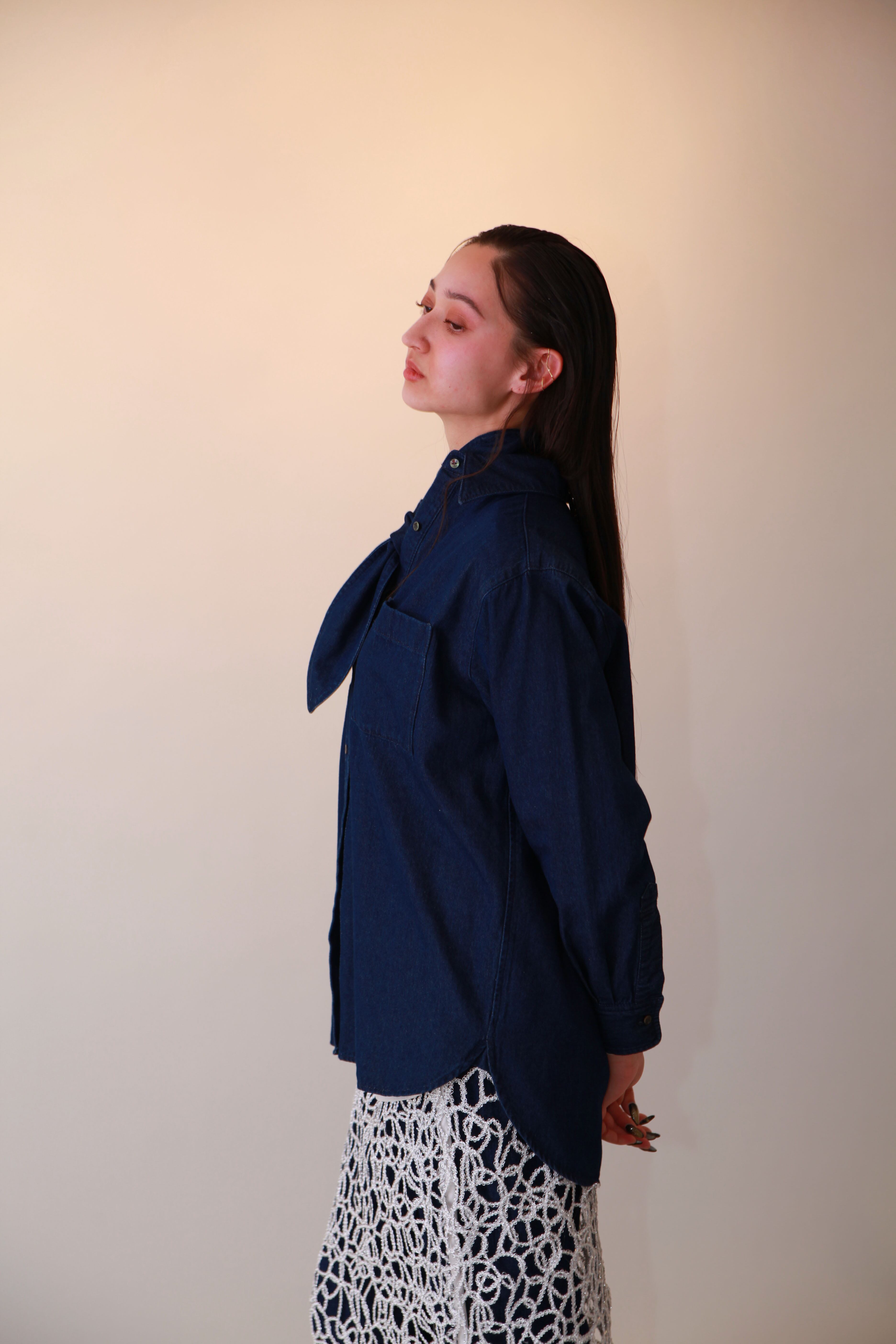 柔らかいデニム生地を使用したデニムシャツです。一枚での着こなしはもちろん、ボタンを開けて羽織としても着回せます。ボウタイは取り外しができ、気分に合わせて様々なアレンジが楽しめます。本貝釦を使用しているところもポイントです。