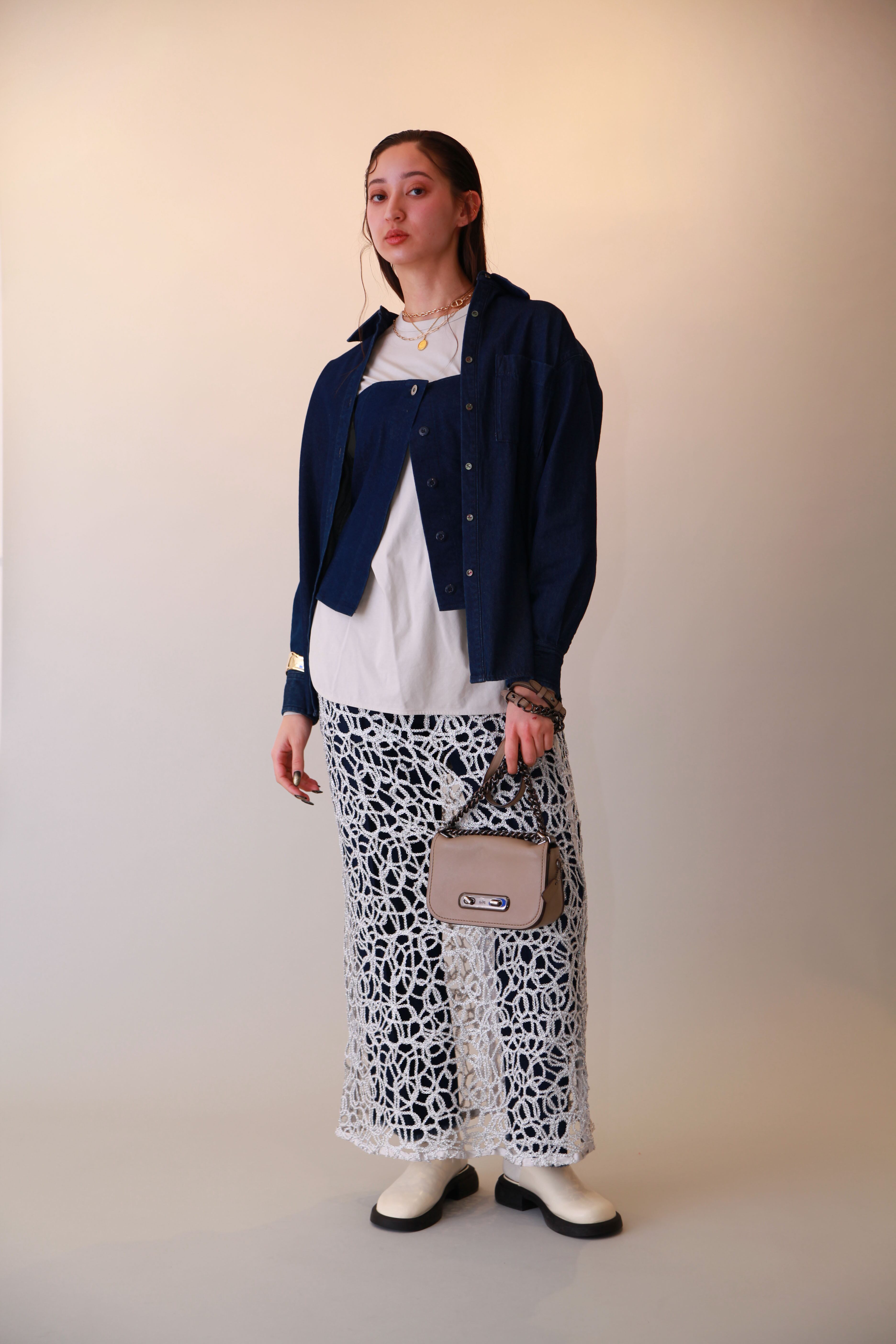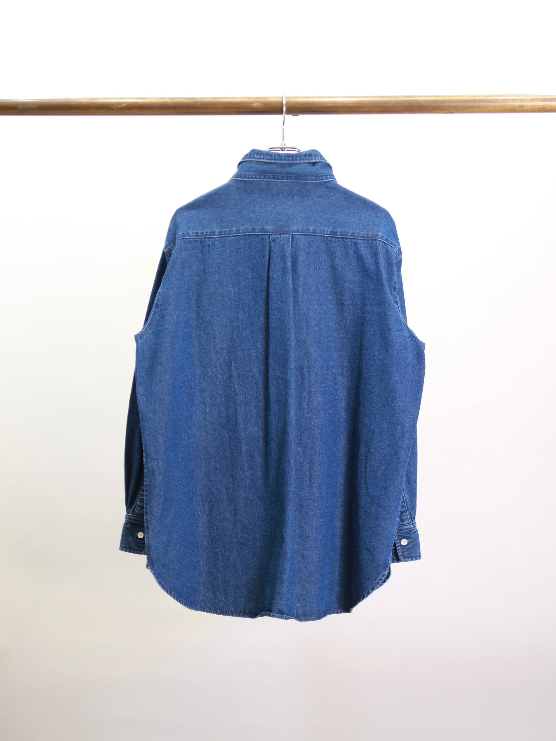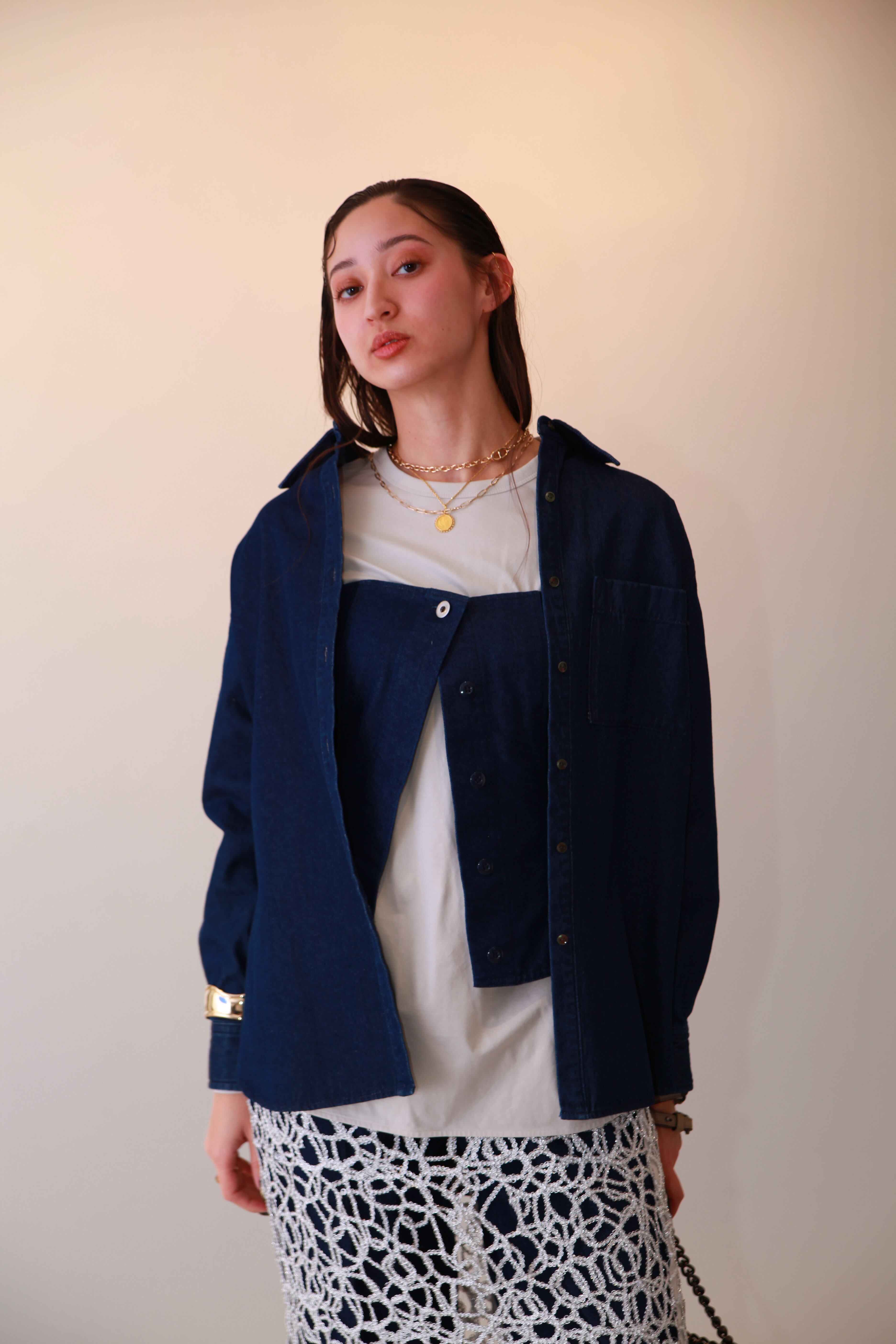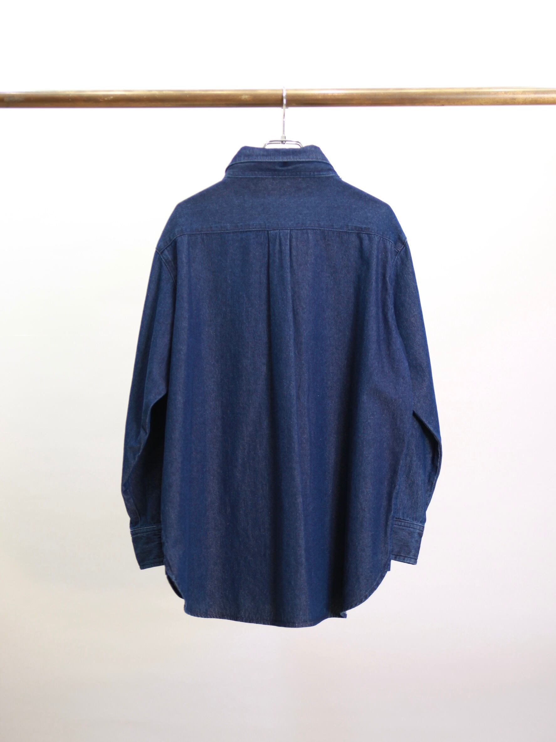 柔らかいデニム生地を使用したデニムシャツです。一枚での着こなしはもちろん、ボタンを開けて羽織としても着回せます。ボウタイは取り外しができ、気分に合わせて様々なアレンジが楽しめます。本貝釦を使用しているところもポイントです。