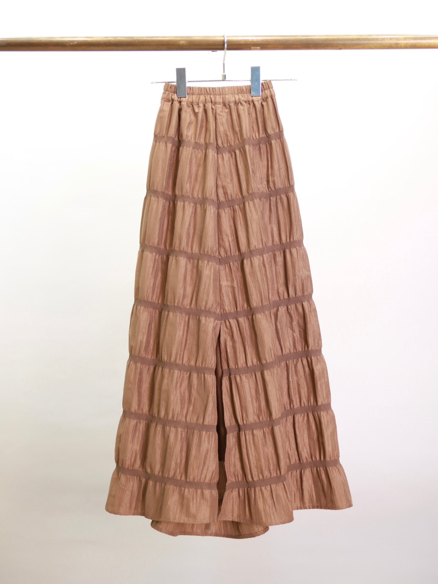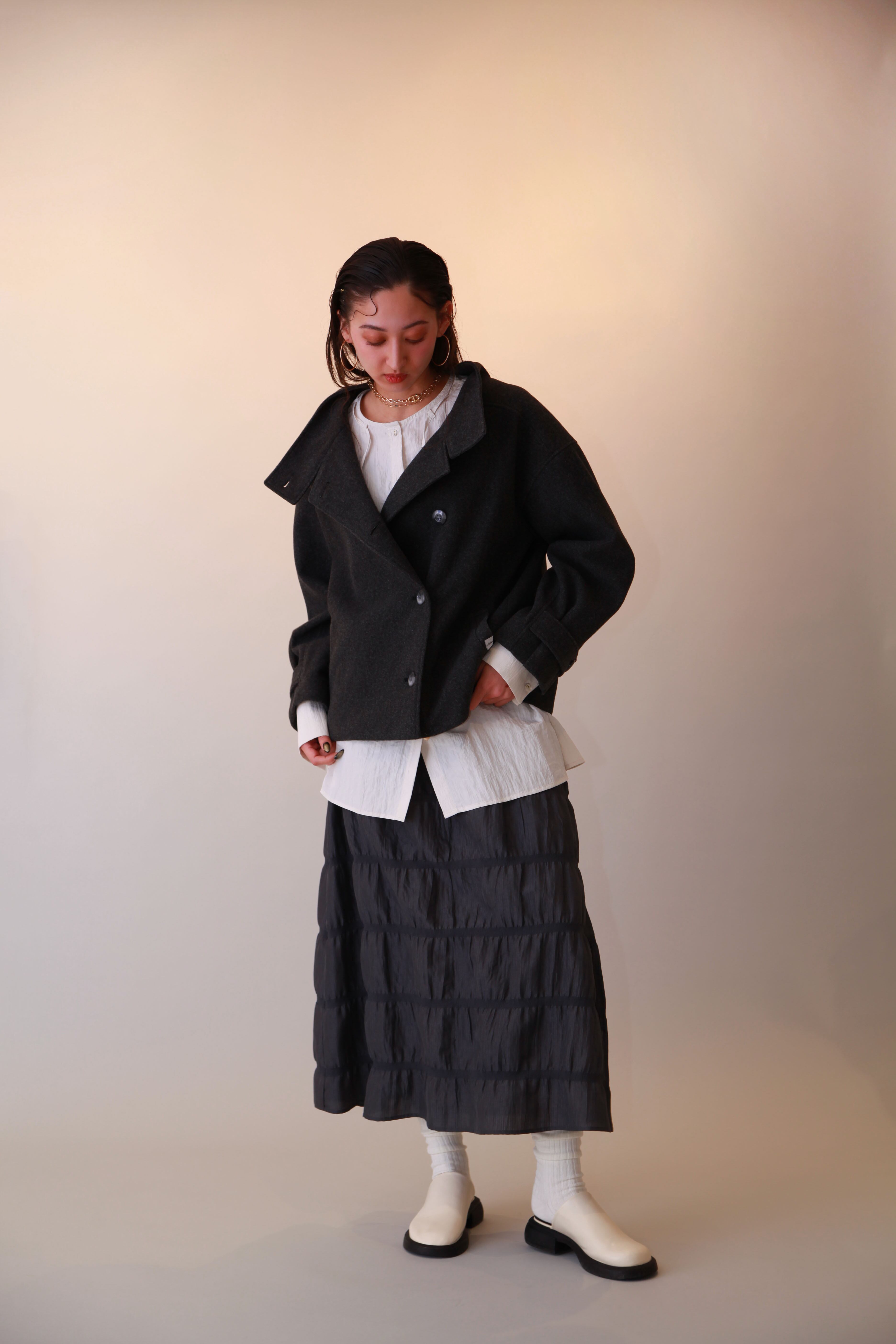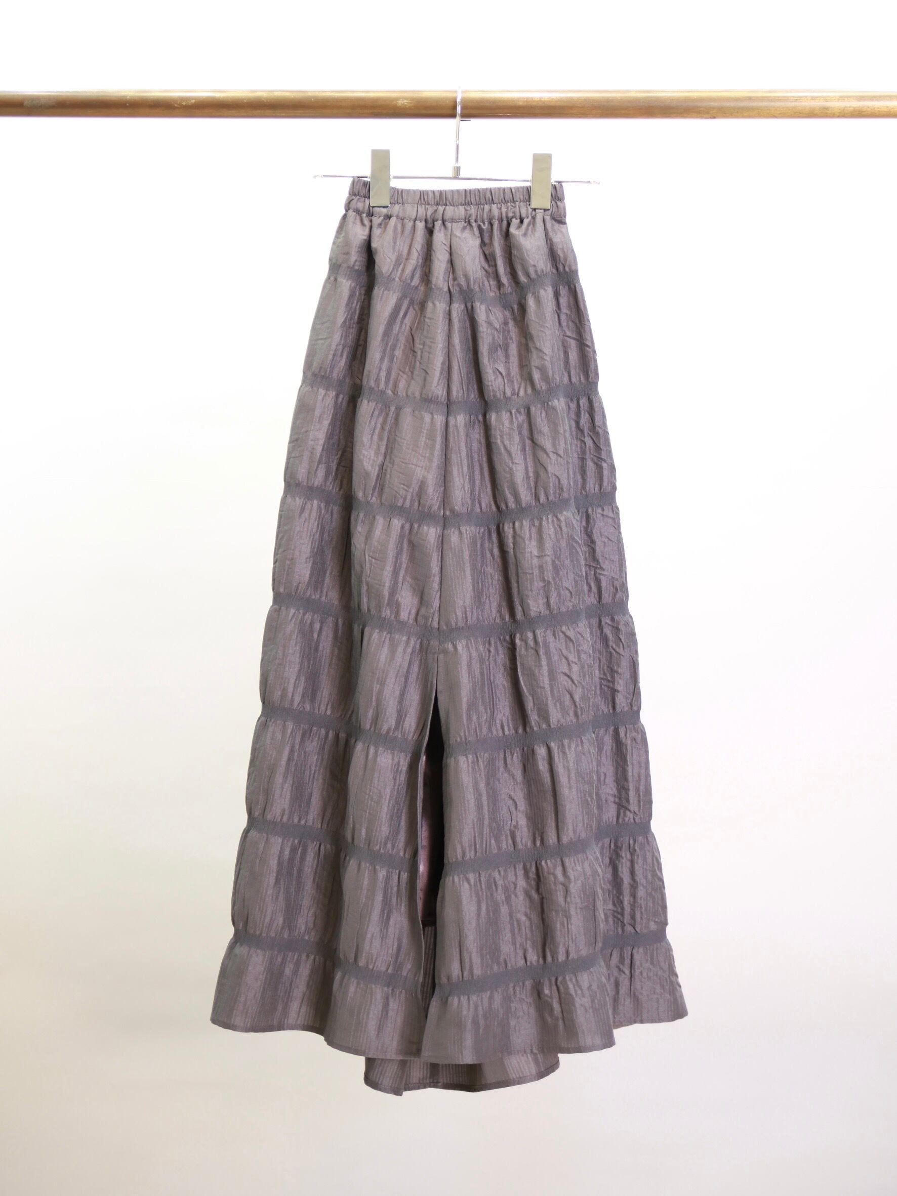 タフタ加工を施しているので、シンプルなデザインながらも素材の個性を際立たせたスカートになっています。ウエストゴムの履き心地に良さもデイリーに嬉しいポイント。ベーシックなスタイリングに合わせると、スタイリングに華やかさをプラスすることができます。