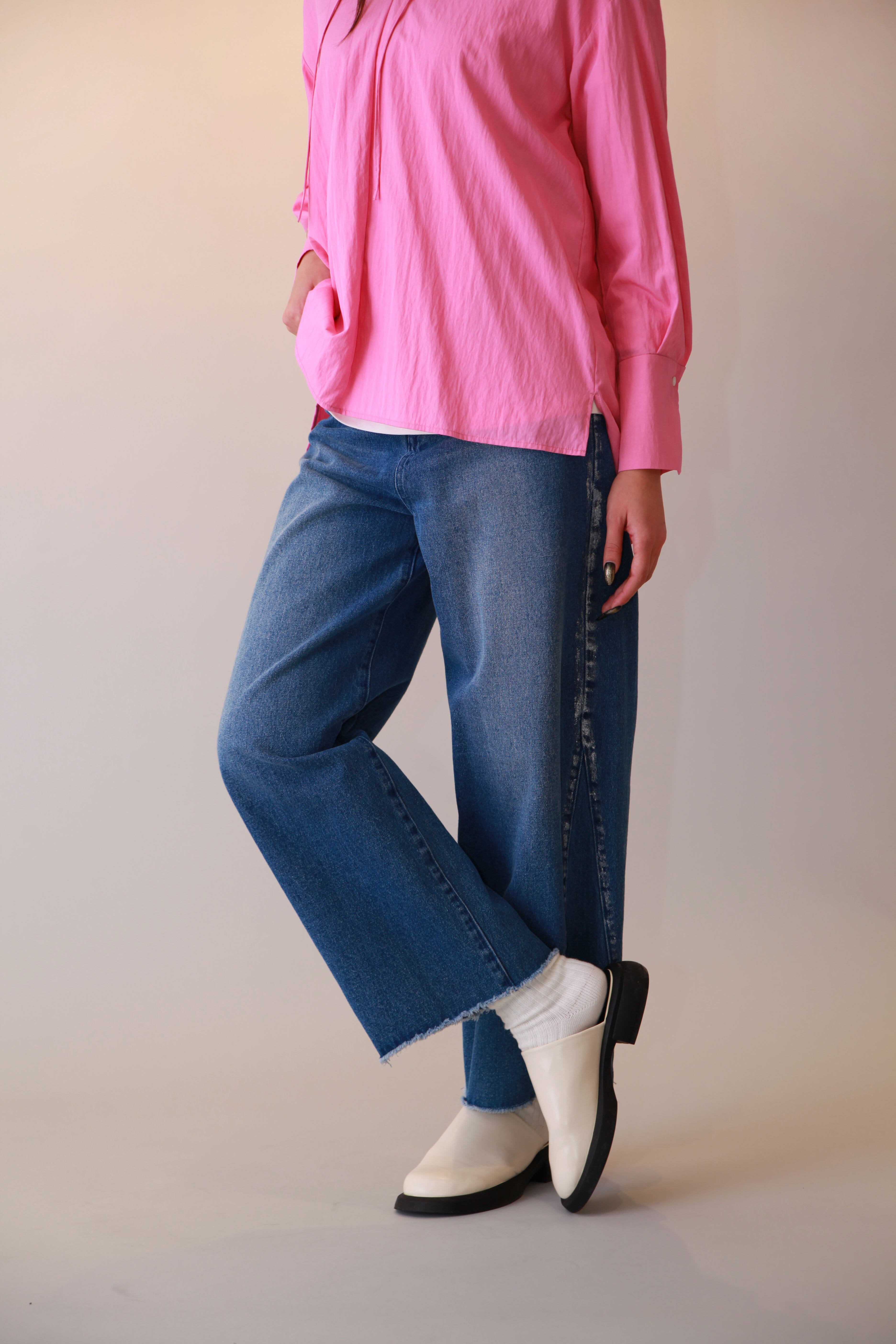 サイドに施された箔プリントが目を引くカーブデニムパンツ。立体的なカーブシルエットが特徴で、ワイドなデザインにより足のラインを美しくカバーしてくれます。程よい柔らかさのデニム素材を使用しているため、軽い履き心地でオールシーズン活躍するアイテムです。